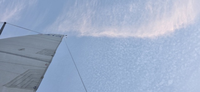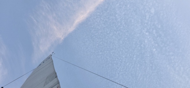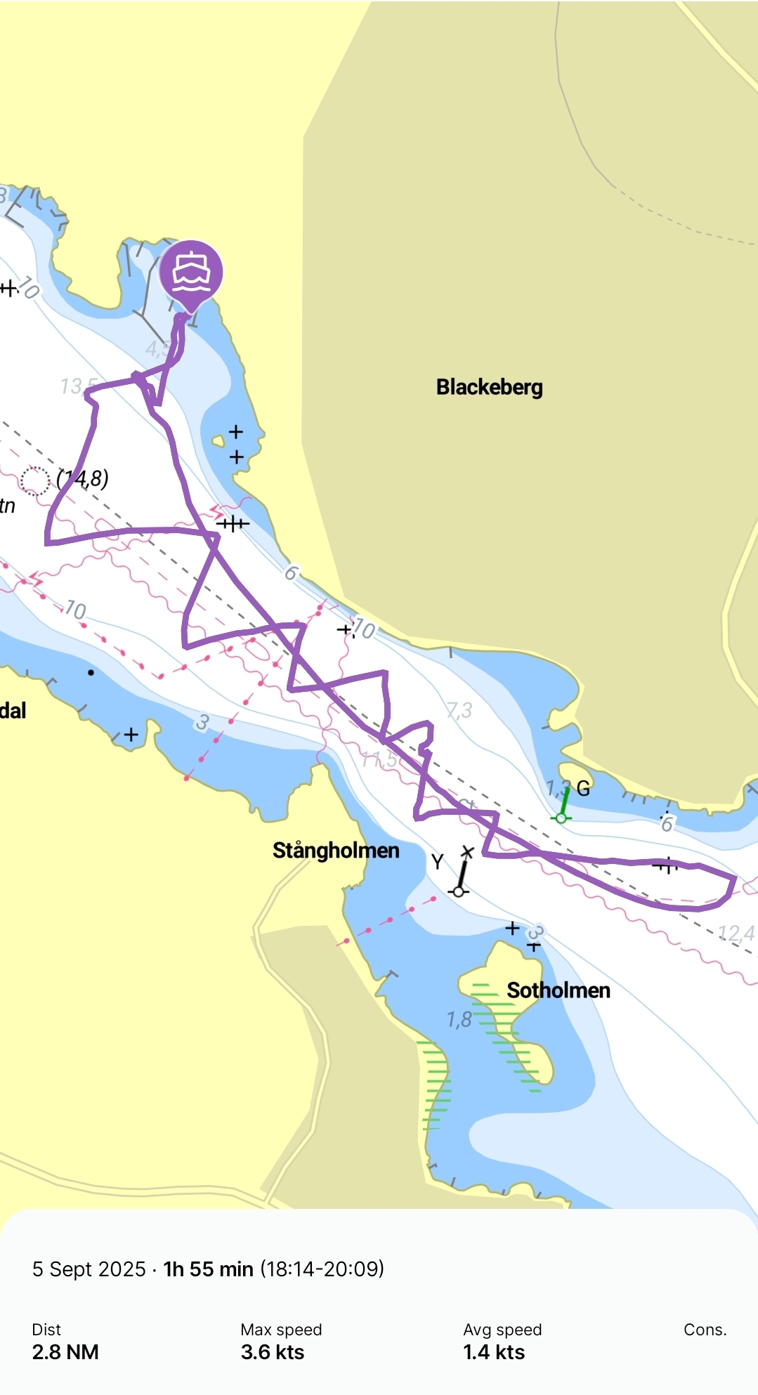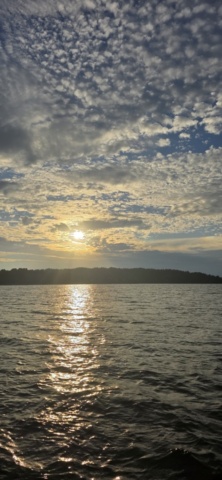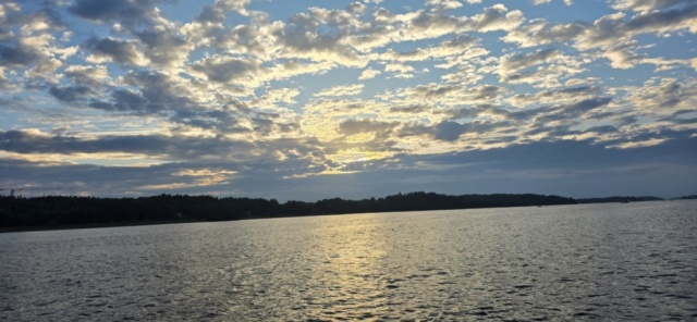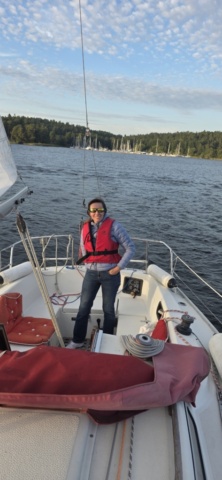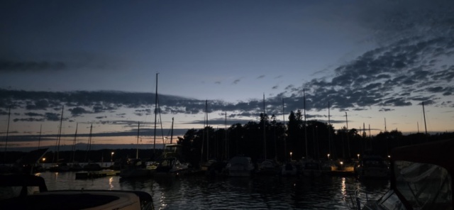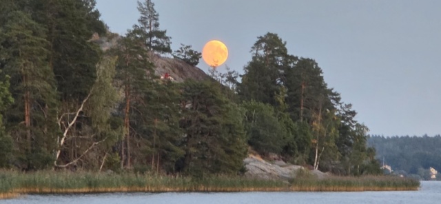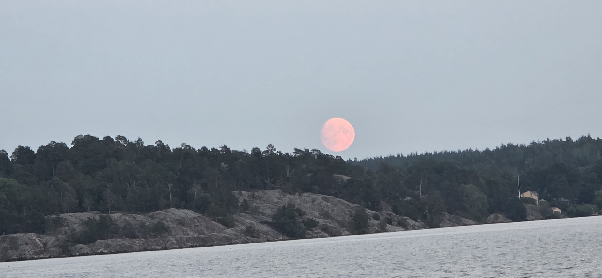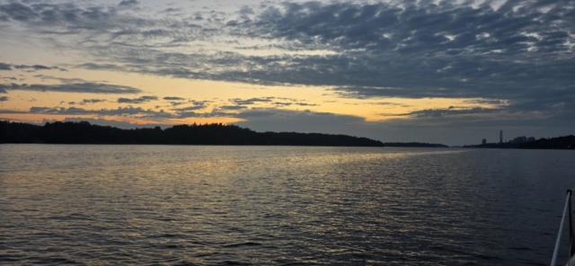 Давно не были на лодке – почти с месяц. Расчехлили грот. Масло и глюколь в норме. Лене показалось, что мотор не выплёвывает воду, но только показалось. Вышли мы отлично. Дул лёгкий Зюйд-Ост. Лена сразу стала утепляться. Подняли грот. Поскольку Зюйд-Ост мог быть либо строго встречным, либо строго попутным, мы выбрали идти ему навстречу, чтобы легче было возвращаться. Чтобы не суетиться со стаксель-шкотами при частой смене галсов, стаксель так и оставили неразвёрнутым. Там-сям проезжали катера, реже яхты. Небо за облаками художественно украшено солнцем. Пролетел одинокий серый журавль. А канадские гуси уже очень активно тренируются для грядущих перелётов. Мы с Леной залезли в телефоны и слегка нарушили чёткие стежки наших галсов. Но лёгкий Зюйд-Ост и лишь поднятый грот позволяли нам немного пренебрегать аккуратностью. Я тоже надел куртку и заблаговременно зажёг лантерны. Лена успела поговорить с Аней. Ветер стал заметно стихать. Мы медленно докатились до яхт-клуба Ängby и оттуда повернули назад идя левым галсом на фордевинде. Ветер совсем не ощущается, но визуально мы двигаемся. Пора пить чай с печеньками и шоколадкой. За кормой остаётся едва видный шлейф. Вдруг из-за скалистых холмов в Зюйд-Вестном направлении очень быстро появилась огромная красная луна. Было прямо видно как одна поднималась сродни воздушному шару. А с другой стороны по нашему курсу левее догорал остаток дня, ещё не окончательно посадив солнце за горизонт. При почти полном отсутствии ветра я позволил гроту произвольно перекинуться налево. Мы приблизились к нашему клубу. На моторе спустили грот. Штатно пришвартовались. Прибрали на лодке и начали потихоньку забирать некоторые вещи домой. Вот и лето прошло, словно и не бывало.